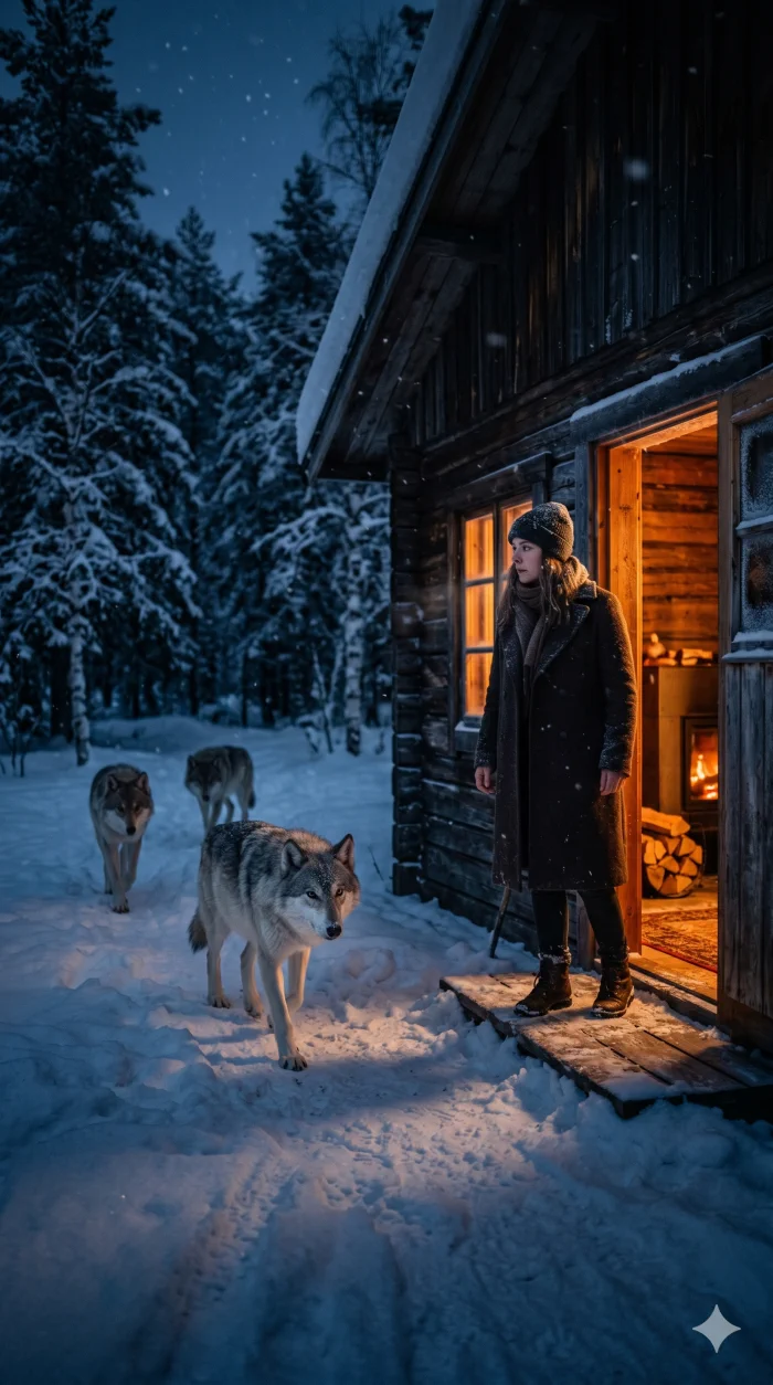 Te noći oluja je menjala glas. Vojenje je bilo bliže, dublje, kao da dolazi iz zemlje. Ona je prišla prozoru – i videla ih. Četiri vuka. Nisu kružili, nisu revali, nisu udarali šapama. Stajali su tik uz vrata, očiju uprtih u pravougaonik svetla iz sobe. U krznu im se belio inje, pokreti bili tromi, promrzli. Nešto u njihovom držanju nije mirisalo na lov; mirisalo je na beg. Na kratku pauzu od zime.