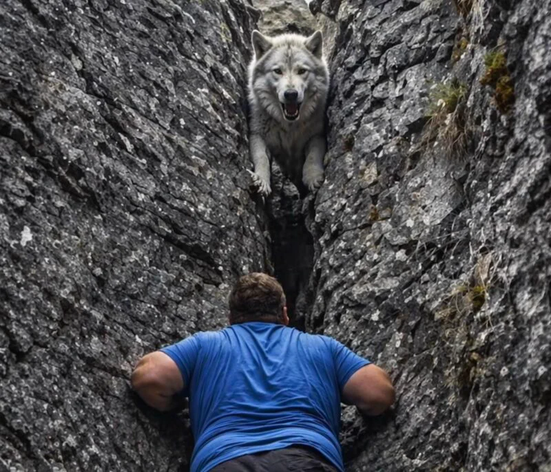 U tom zamrznutom treptaju čovek nije ni stigao da reaguje. Vuk je bio tačno ispred njega. Razdaljina u kojoj skok, ugriz, napad – deluju neizbežno. 😱
