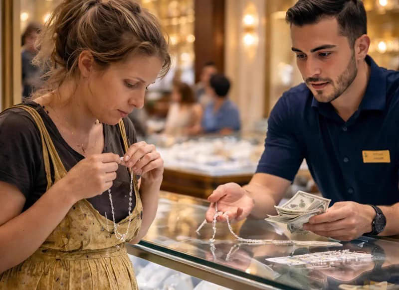 U prodavnici je naglo utihnulo. Ona je pažljivo skinula ogrlicu, kao da skida dah sa grudi, i položila je na staklo. Mladić je uzeo komad nakita, odmjerio ga iskusnim okom, prevrnuo nekoliko puta pod svetlom i kratko procenio: