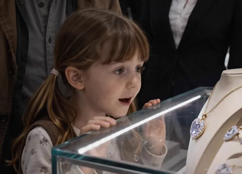 Mala devojčica stajala je na prstima, gotovo nalepljena na hladno staklo vitrine, očiju punih svetlucave čežnje. Kamenje na kolijéu presijavalo se meko, kao da je u njima zarobljeno živo svetlo. Dlanovima je nežno dodirnula staklo i tiho, iskreno, prošaputala: