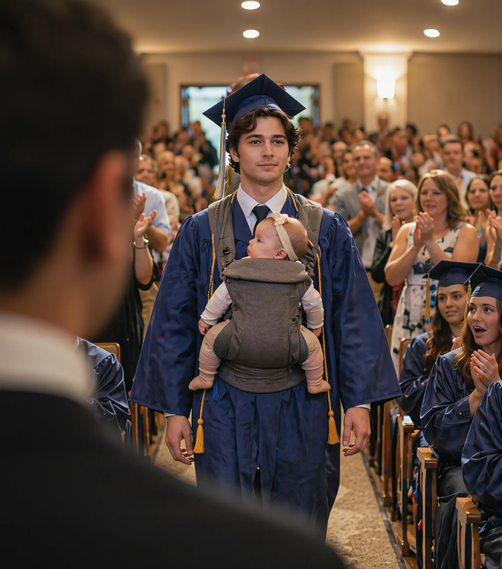 Ceremonija je tekla kao sve druge: imena, aplauz, govori. Onda je Adrijan istupio iz reda i krenuo pravo ka meni. „Mama,“ prošaptao je, pružajući ruke, „daj mi je.“ Telo mi je krenulo pre pameti. Spustila sam majušno biće u njegove ruke. Privio ju je na grudi, pod togu, lice joj je provirivalo iz ružičaste ćebice. Okrenuo se — i pošao ka bini. 👶💗